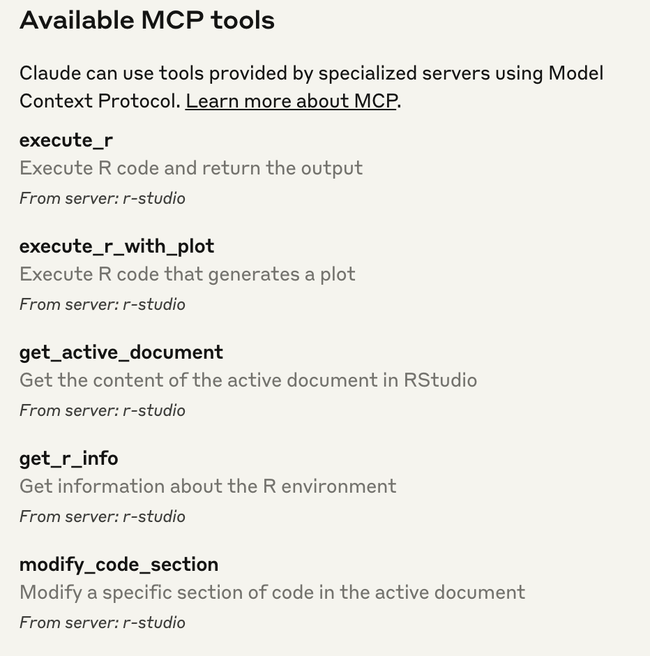 The {ClaudeR} package is a wrapper for the MCP API that allows Agents to use Rstudio. As of today (April 15, 2025), it is the only R package that I am aware of that integrates Rstudio/Positron with MCP. I am betting that we will see more ‘official’ R packages from Posit or cynkra in the coming weeks that will provide additional ways to use MCP in Positron and specific R packages.