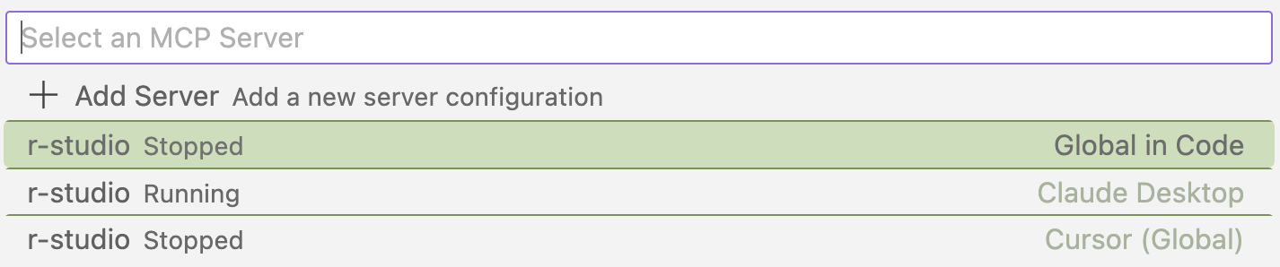 # Start the MCP server in Rstudio, a Shiny app will open in the Viewer pane